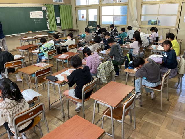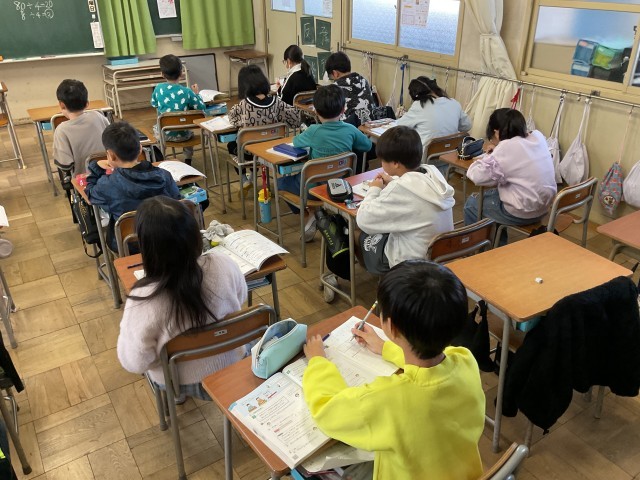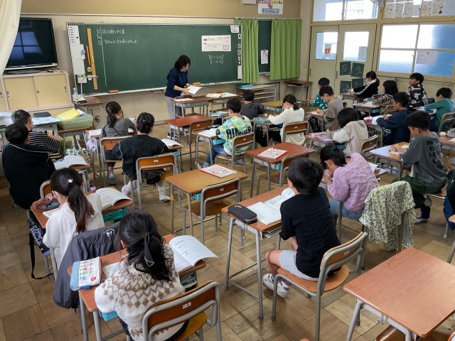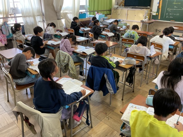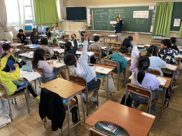 3年生の算数の授業では、「分数と割り算」の学習を進めています。たとえば「80cmの4分の1の長さ」は、80cmを4つに分けたうちの1つ分なので、80 ÷ 4 の式で求められることを学びました。子どもたちは先生の説明をよく聞き、問題を解き、ノートにしっかり考えを書きながら学んでいます。