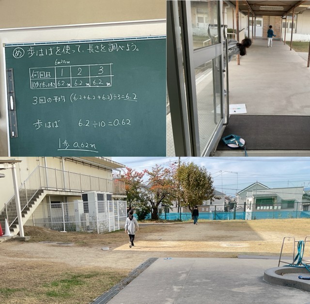 (自分の歩幅)×(歩数)=(実際の長さ)になります。同じ場所の長さを2人で歩き、歩数から計算して長さを比較します。2人で結構近い長さになった場合は、これぐらいの長さなんだなと実感していました。体を使って学習することは理解を深める上で大切なことだと思いました。