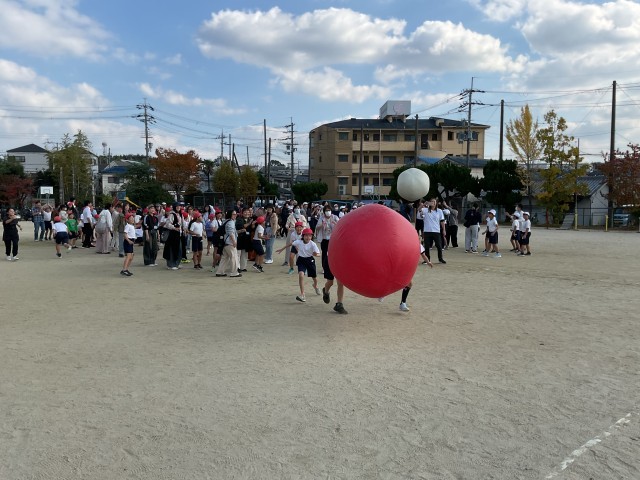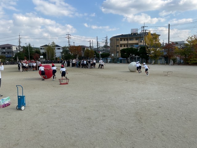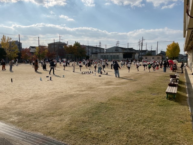 運動場では4年生が「ミニ運動会」を行っており、保護者の方々と一緒に楽しそうに活動しています。笑顔あふれる温かな雰囲気の中で、子どもたちは元気いっぱいに取り組んでいます。