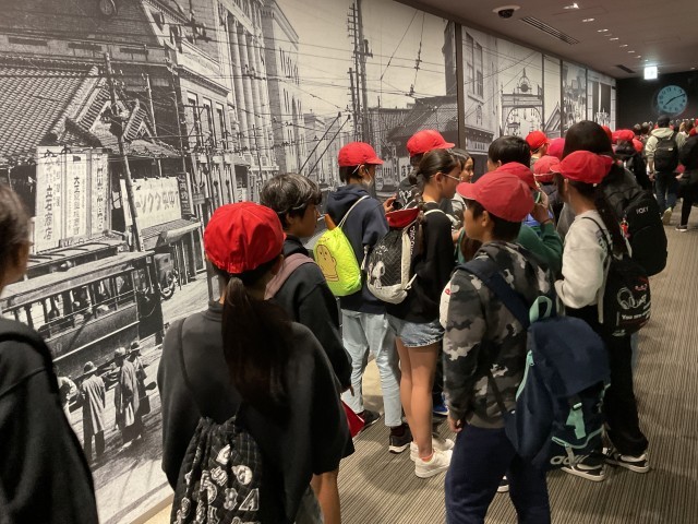平和記念資料館では、たくさんの入館客の中、被爆資料や遺品を見学し、戦争の怖ろしさや平和の大切さを感じ取っていました。さらに、公園内の平和の鐘や慰霊碑などを班ごとに訪問しました。