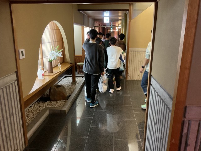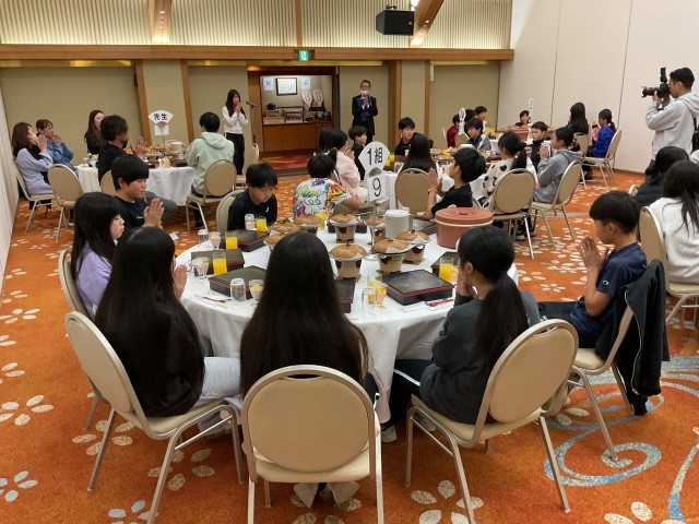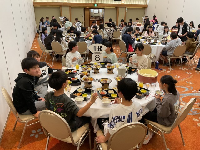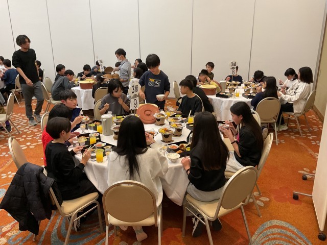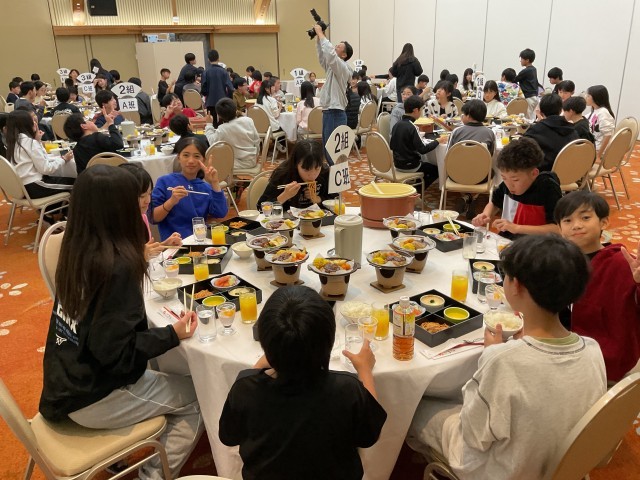 ホテルに戻った子どもたちは、部屋でのんびり過ごしたり、お風呂に入ったりしながら、疲れを癒しつつ友達と楽しい時間を過ごしました。その後、食事会場に移動し、夕食をテーブルごとに楽しくおしゃべりしながら、美味しくいただきました。