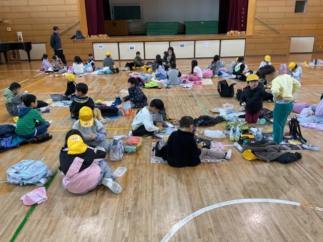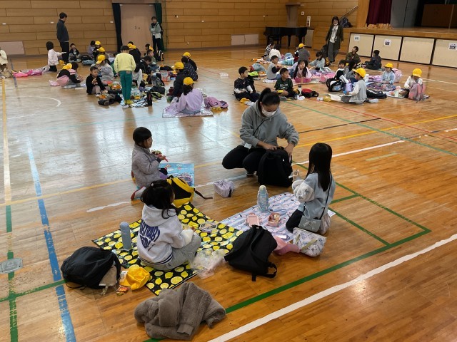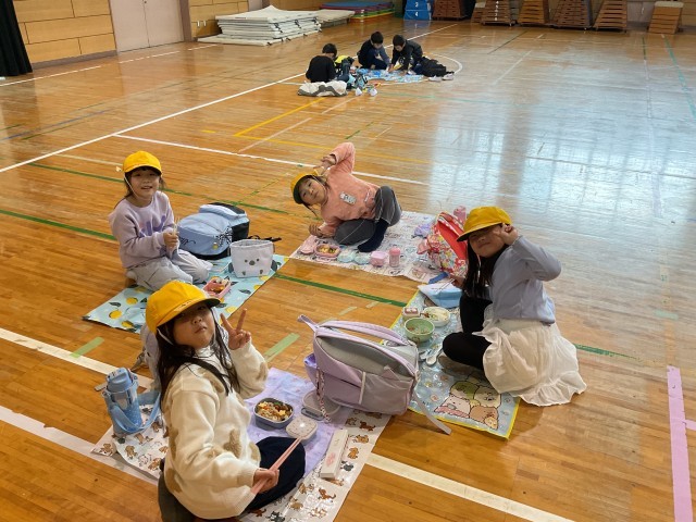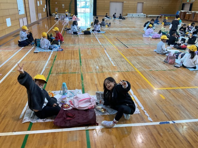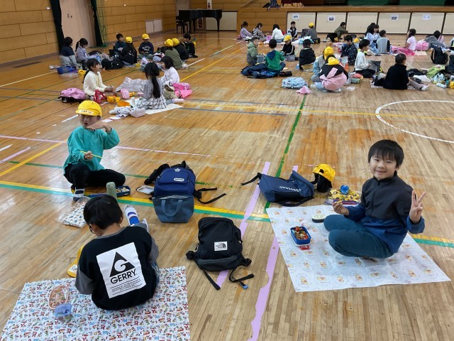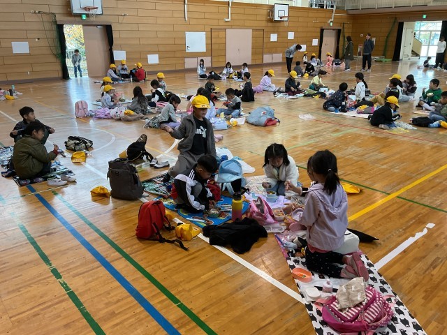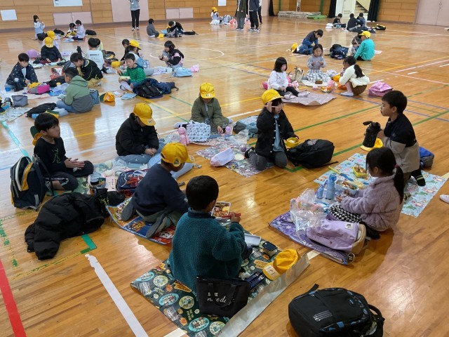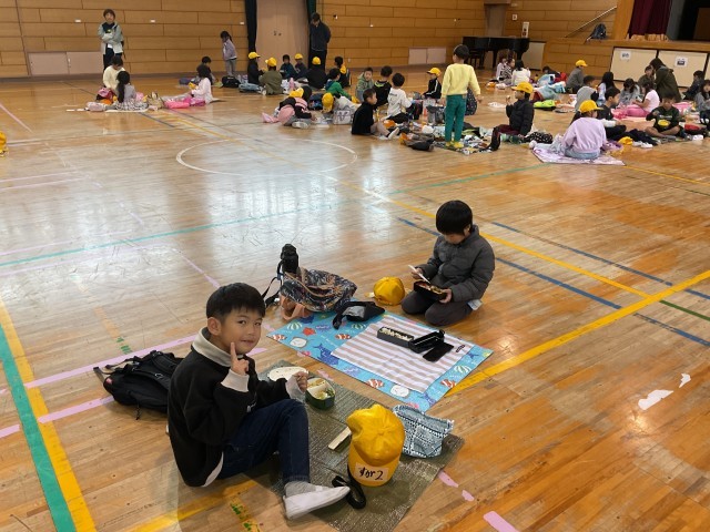11月25日(火) 秋の校外学習(1年生)その6 公開日 2025/11/25 更新日 2025/11/25 学校の様子 ニフレルでの見学終了後、公園で弁当を食べる予定でしたが、朝からの雨が降り続いていたため、やむを得ず学校に戻り、体育館で子どもたちが楽しみにしていた弁当の時間を取りました。子どもたちは楽しくおしゃべりしながら、美味しそうに弁当を食べていました。 +6 いいね(0)