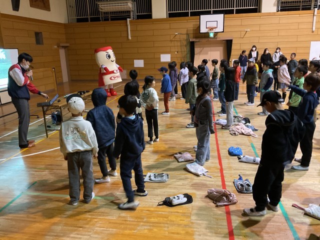 さらに、「お腹を元気にするための体操」も行い、ヤクルトマンも登場!子どもたちはとても楽しそうに触れ合っています。最後には、子どもたちとヤクルトマンとの記念撮影もあり、子どもたちと保護者の方にヤクルトが配られています。皆んなと一緒に健康について考える有意義な時間となりました。
