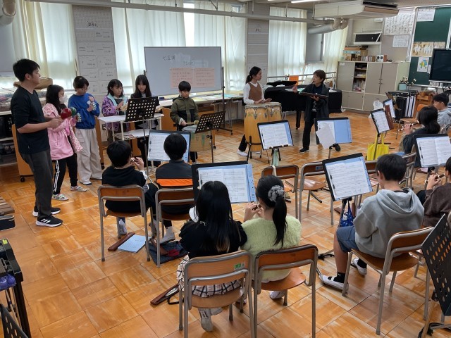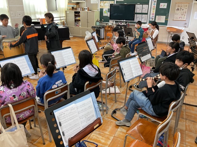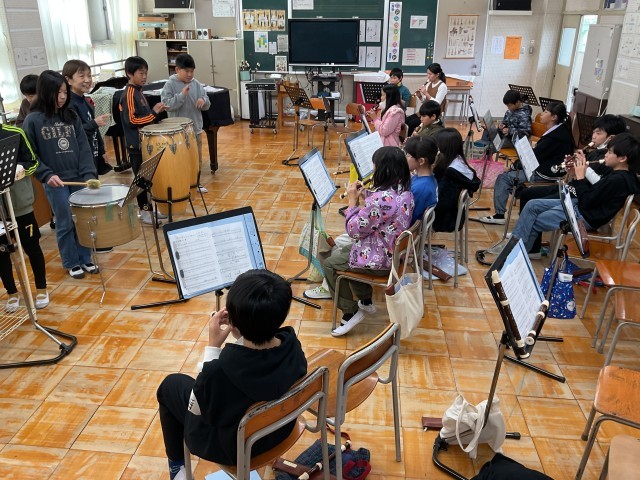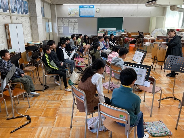 5年生の音楽の授業で、『アメリカンシンフォニー』を鈴、タンバリン、小太鼓、パーカッションなどの楽器とリコーダーで演奏しています。楽器は交替しながら担当し、リズムを合わせる楽しさや楽器演奏の楽しさを感じながら取り組んでいます。演奏後は、『待ちぼうけ』を鑑賞し、1番から4番までの歌詞を読み取りながら、先生の質問にしっかり答えています。子どもたちは、歌詞に込められた作者の思いを感じ取り、合唱練習にも意欲的に取り組んでいます。
