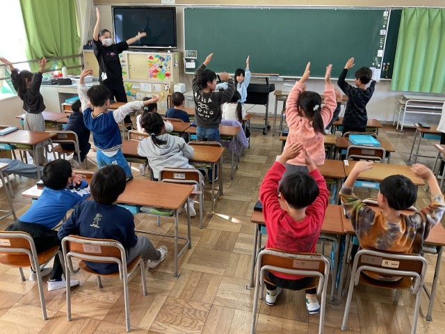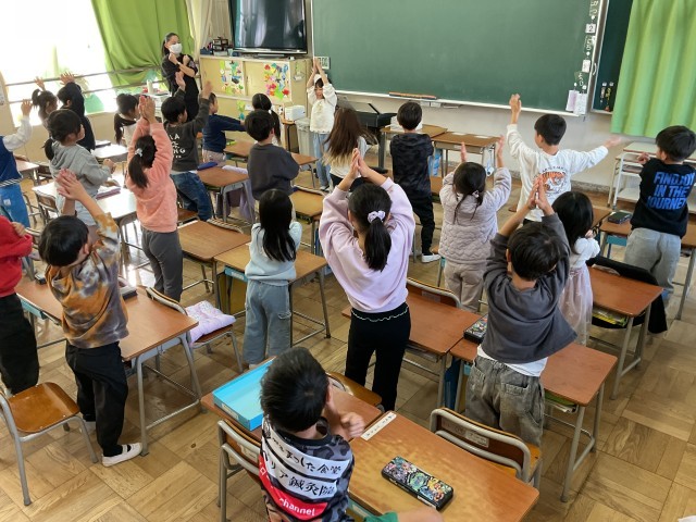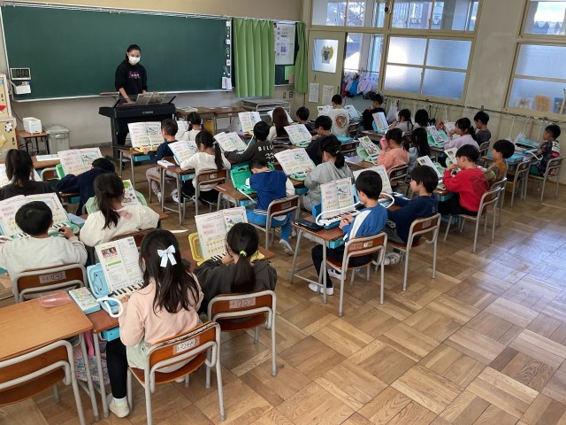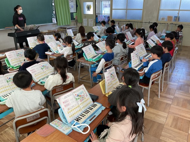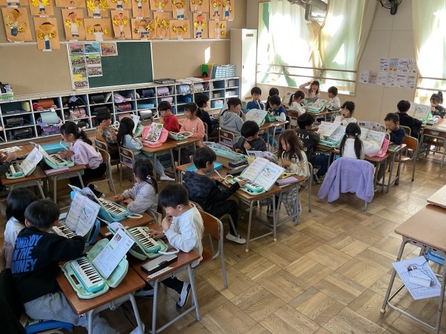 1年生の音楽の授業では、まず動きのある手遊びをゲーム形式で楽しみ、笑顔いっぱいの体を使ったウォーミングアップになっています。その後、鍵盤ハーモニカを使って『日の丸』の演奏練習に取り組んでいます。グループに分かれ、お互いに音を確認し合いながら練習を進め、繰り返し挑戦するうちに楽譜を見なくても鍵盤をしっかり弾けるようになってきています。「目を閉じてするから」と言って、楽譜を見ずに上手な演奏を聞かせてくれます。音楽を通して集中力や演奏の楽しさも学んでいます。