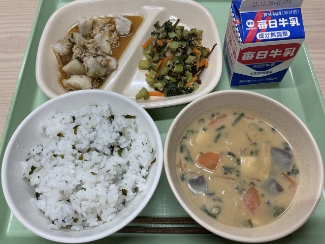 今日の給食の献立は、「呉汁・揚げ里芋のそぼろあんかけ・小松菜とツナの柚子和え・ご飯・牛乳」です。すりつぶした大豆と野菜などの色々な具材の旨みがだしに溶け込み、コクのある一杯です。揚げ里芋のそぼろあんかけは、外は香ばしく、そぼろの旨みと甘辛いあんが絡み、小松菜とツナの柚子和えは、さっぱりとした味で、今日も美味しくいただきました。
