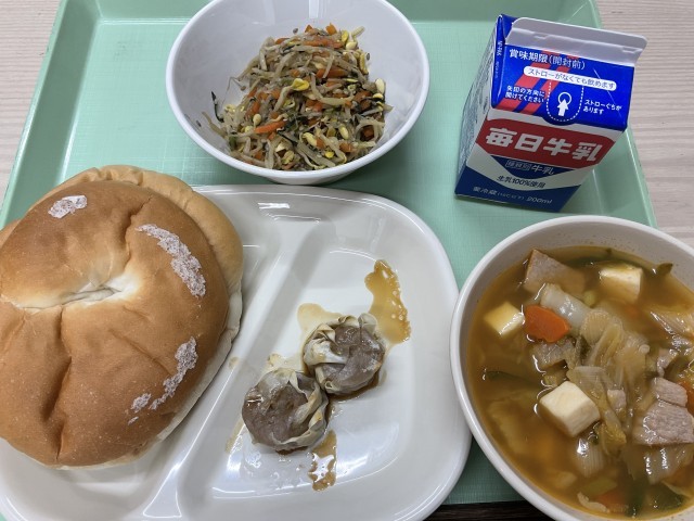 今日の給食の献立は、「豆腐チゲ・焼売・もやしのナムル・渦巻きパン・牛乳」です。