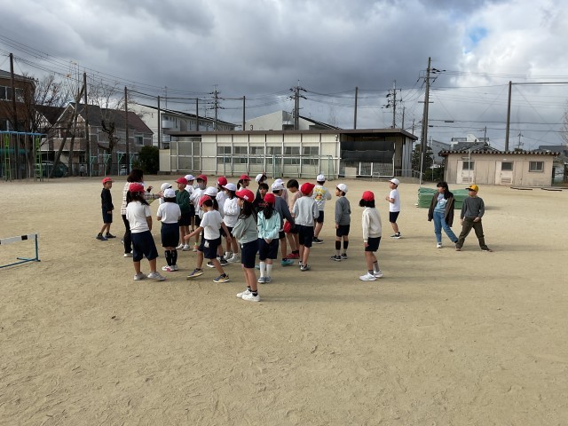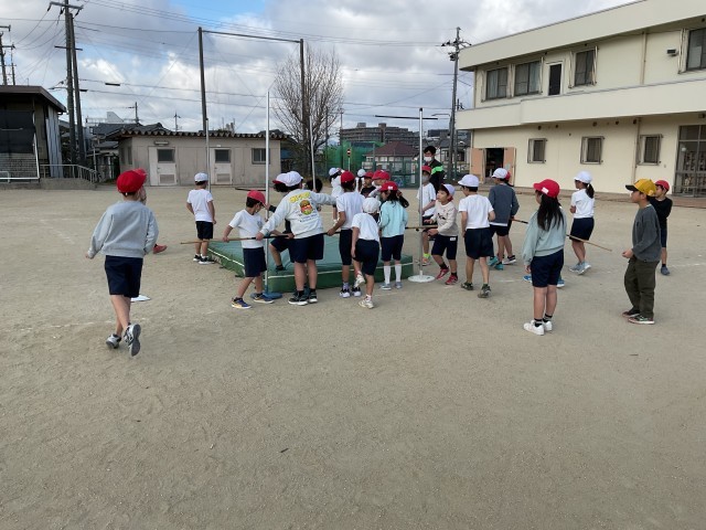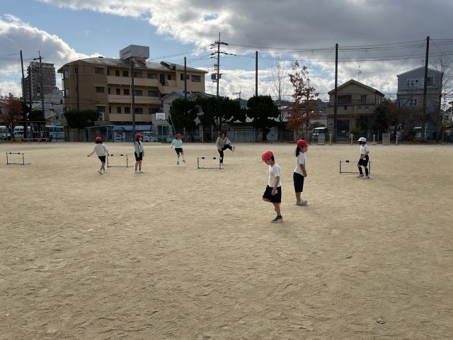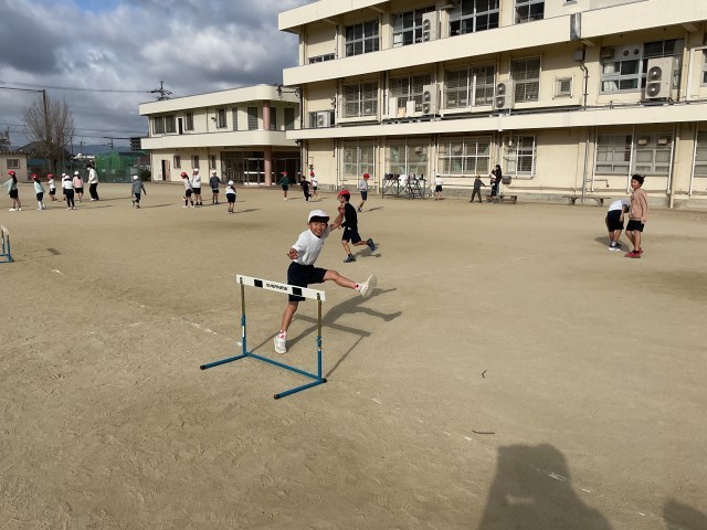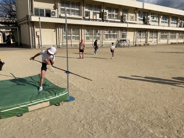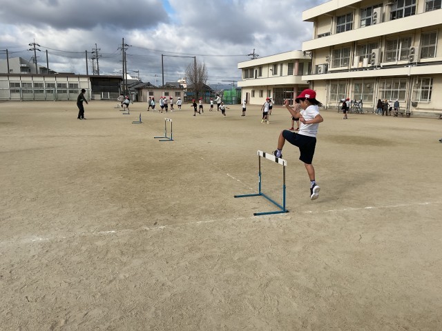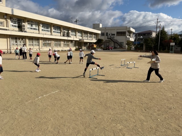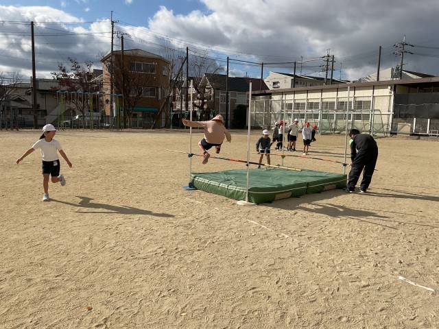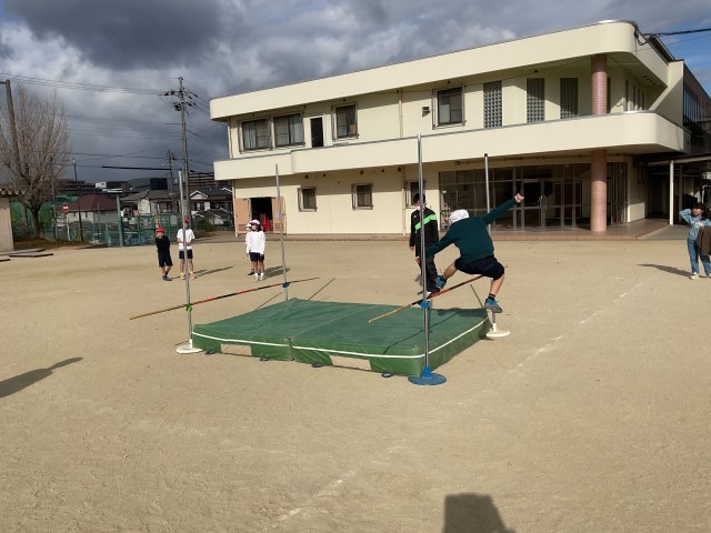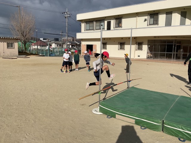 3年生の体育の授業では、高跳びの学習に取り組んでいます。最初は「スモールステップ」練習として、ハードルを使い、一番低い高さから子どもたちの能力に応じて徐々に高さを上げながら練習できるよう工夫しています。短い助走でバーをまたぐ、踏み切りのタイミングを考える、軽く跳ぶなど、段階的に動きを確認しながら練習を重ねています。その後、大きなクッションマットを置いて本格的な高跳びに挑戦しています。子どもたちは繰り返し取り組む中で体の使い方やタイミングを工夫し、少しずつ上達しています。準備も片付けも、子どもたちで協力して行っています。
