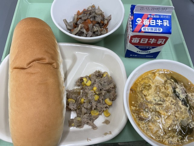 今日の給食の献立は、「サンラータン・ツナコーン・エリンギの炒め物・コッペパン・牛乳」です。サンラータンは、たくさんの具材が煮込まれ、卵でとじられていてとろみのあるスープで体が温まります。ツナコーンは、ツナの旨みとプチプチコーンの甘みもあり、エリンギの炒め物は、コリコリとした食感と香ばしさが楽しめ、今日も美味しくいただきました。