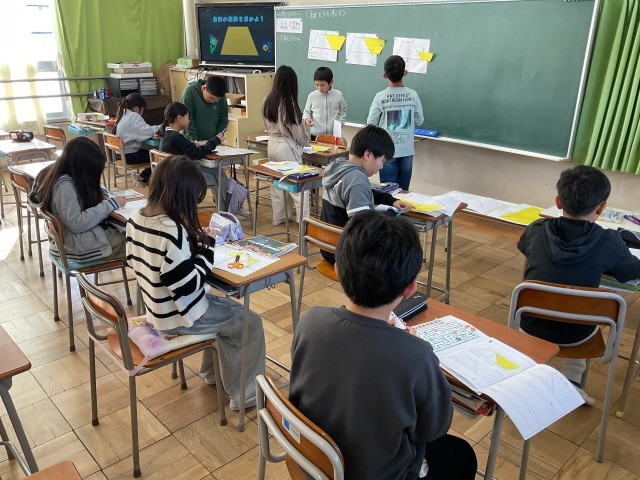 5年生の算数の授業では、提示された台形の面積を求める学習を行っています。子どもたちは、形と大きさが同じ黄色の台形の紙を使い、「そのまま並べる」方法や「切って移動させる」方法など、多様な工夫で面積を求めています。子どもたちそれぞれが考えた求め方を黒板に提示し、その根拠を説明しています。その後、それらの様々な求め方が、最終的に、「(上底+下底)×高さ÷2」という台形の面積公式に当てはまることを確認し、公式の意味と導き方を理解しながら学習を進めています。