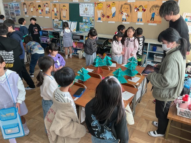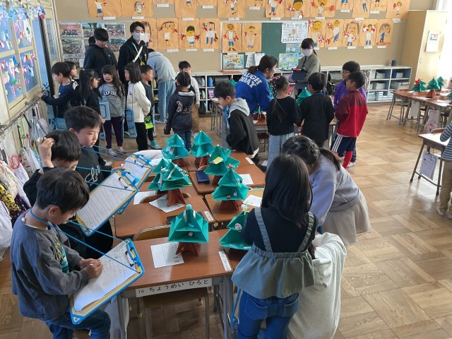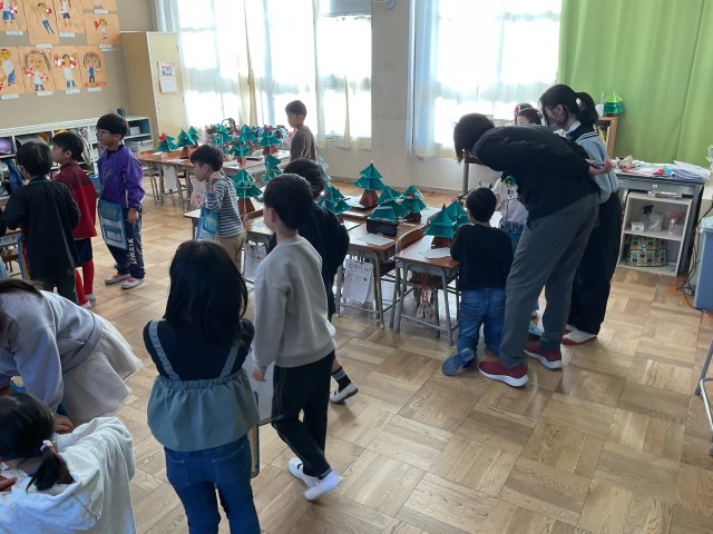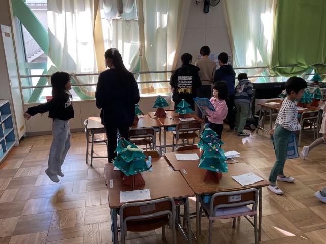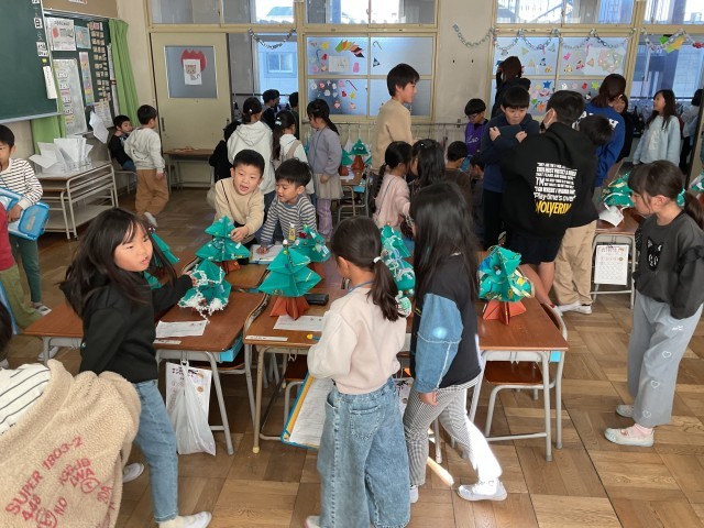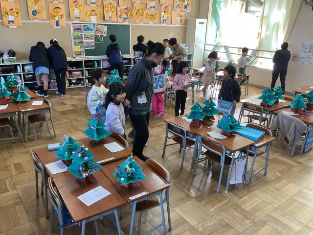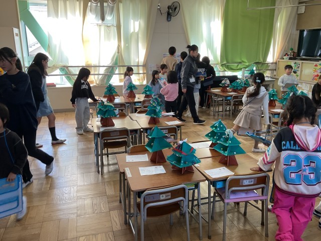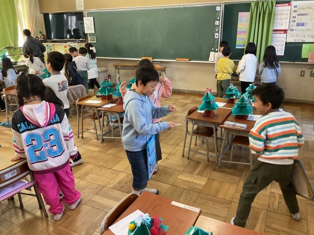 1年生一人ひとりが画用紙で作った手作りのクリスマスツリー。さまざまな飾りが施され、工夫やアイデアがいっぱい詰まっています。子どもたち一人ひとりの机の上にそれぞれのツリーが置かれ、学級の人数分が並ぶ様子はとても見応えがあります。1年生同士でも作品を鑑賞し、良いところを見つけ合い、学級に招待された6年生も、1年生の作品を鑑賞しながら感想を伝え、温かな交流を楽しんでいます。1年生も、お兄さん・お姉さんとの触れ合いを楽しみながら、笑顔で過ごしています。