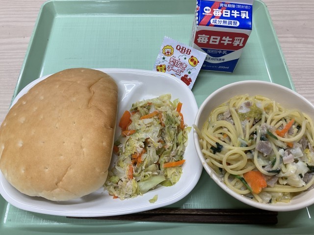 今日の給食の献立は、「冬野菜の豆乳スパゲティ・ササミとキャベツのソテー・型抜きチーズ・オリーブパン・牛乳」です。豆乳スパゲティは、まろやかな味わいで冬野菜の甘みが引き立ち、体も温まります。ササミとキャベツのソテーは、あっさりとしながらも旨味があり、シャキシャキとした食感が楽しめ、型抜きチーズは見た目も可愛らしく、きっと子どもたちに人気だったことでしょう。今日も美味しくいただきました。