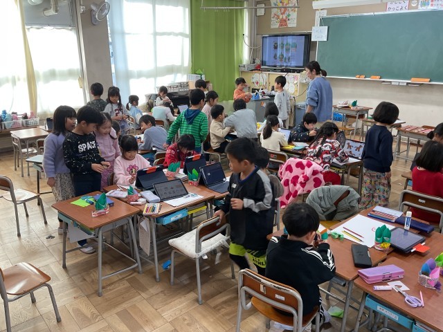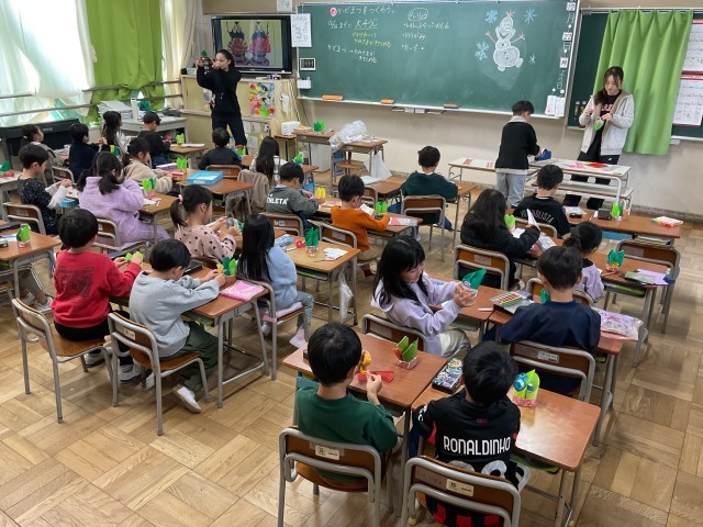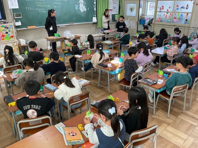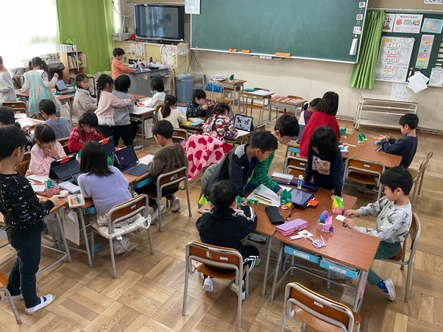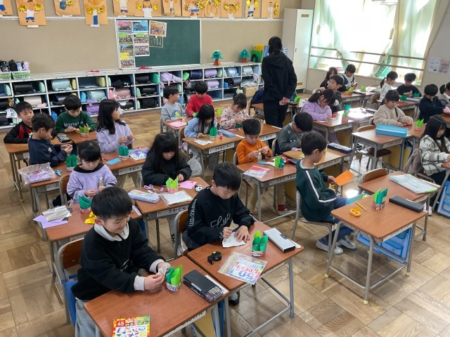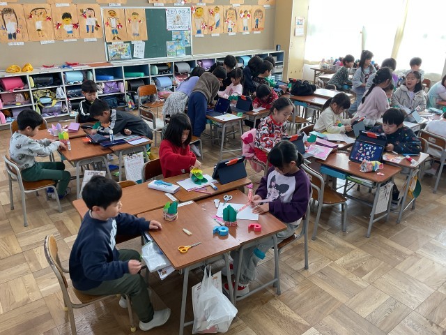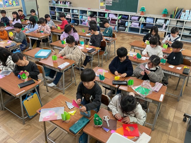 1年生では、正月に飾る「門松作り」に取り組んでいます。 事前に準備したトイレットペーパーの芯や折り紙を使い、子どもたちは自分だけのアイデアを形にしようと、夢中になって手を動かしています。「テープをこう貼れば倒れないかな」、「これ見て」などと一人ひとりが工夫を凝らし、細かいところまで丁寧に仕上げています。個性あふれる門松が次々と完成しています。