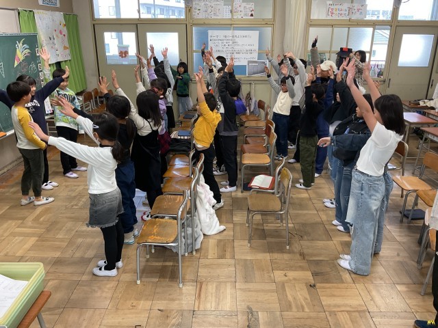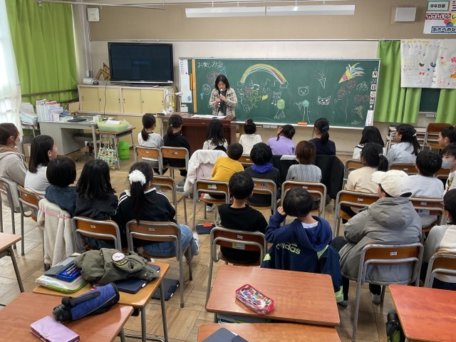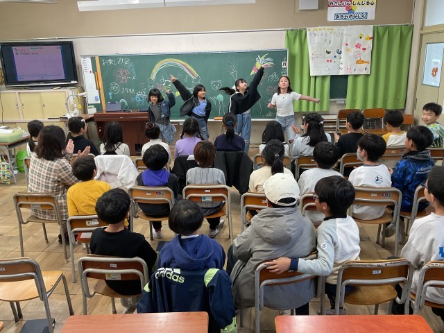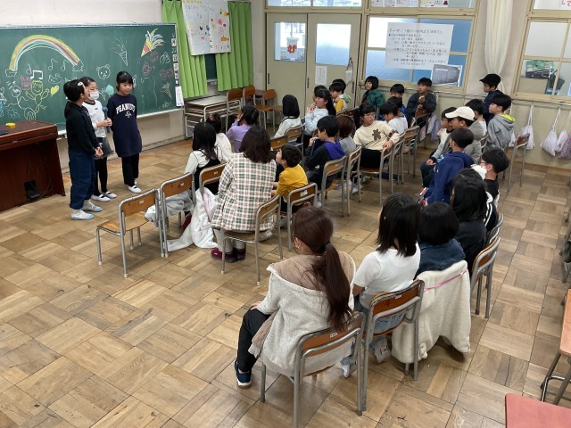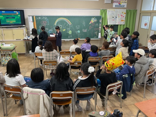 学期末の恒例行事、子どもたちが心待ちにしていた「お楽しみ会」を開催しています。進行を務める司会グループの円滑なリードにより、お楽しみ会は和やかなムードで進んでいます。発表者たちは、今日までの準備と練習の成果を、緊張しながらも精一杯披露してくれています。さらに、担任の先生によるリコーダー演奏もあり、お楽しみ会を盛り上げてくれています。子どもたちは、終始笑顔いっぱい楽しんでいます。