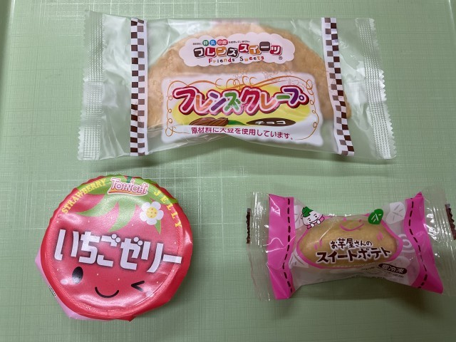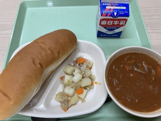 今日の給食の献立は、「ハッシュドポーク・ハムポテト・セレクトデザート・コッペパン・牛乳」です。ハッシュドポークは、豚肉のうま味とコクのあるルウがよく合い、ハムポテトは、ほくほくのじゃがいもにハムの塩味がアクセントとなっています。セレクトデザートは、いちごゼリー・チョコクレープ・スイートポテトの中から1つを選び、子どもたちは