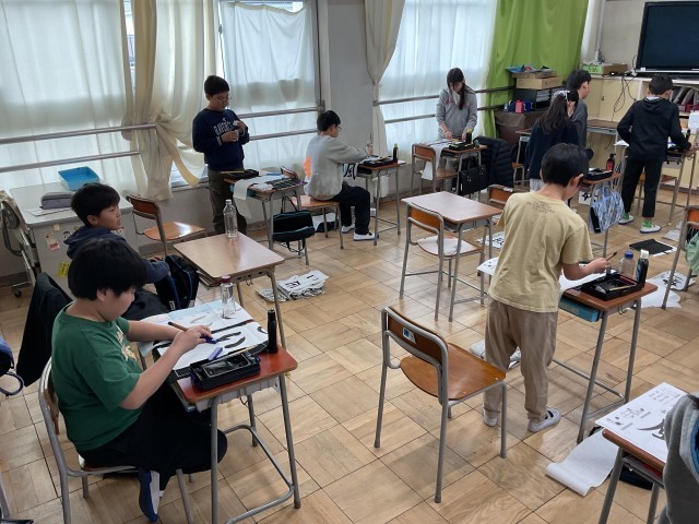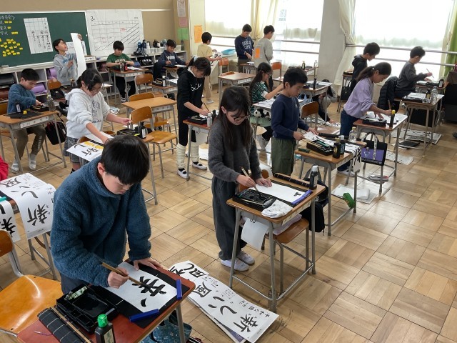 5年生の書写の授業の様子です。新年の書き初めとして『新しい風』の文字に取り組んでいます。子どもたちは筆を使い、文字の形やバランスに気を配りながら、「とめ」「はね」「はらい」「おさえ」などの基本的な筆使いを丁寧に意識して書いています。見本を見ながら、集中して、一画一画を書き進め、真剣に取り組んでいます。
