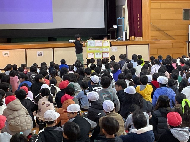 本日も、代表委員の子どもたちの司会で児童朝会を行っています。