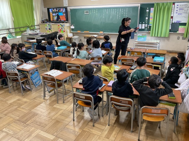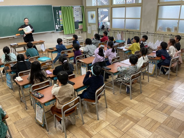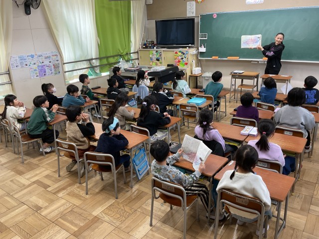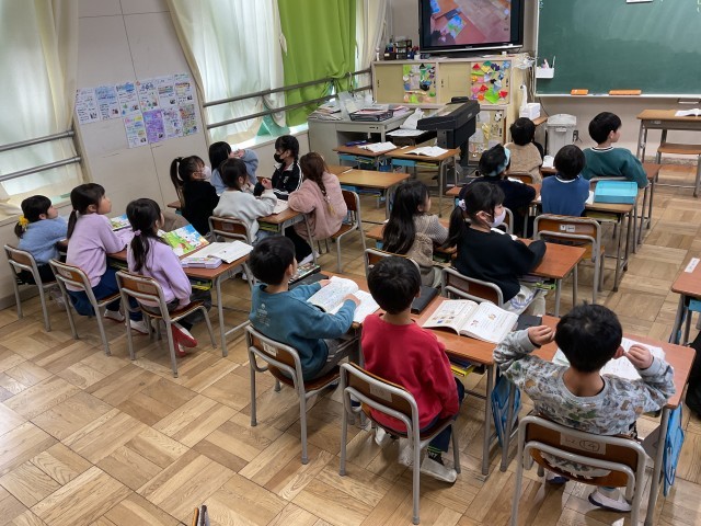1年生の国語の授業では、絵本『スイミー』や『じぶんだけのいろ』を見ながら、それぞれの物語の世界をイメージし、静かにお話を聴いています。子どもたちは絵本を通して感じたことを大切にしながら、単元『おはなしをかこう』の学習へつなげています。この単元では、これまで読書や読み聞かせで親しんできた昔話をもとに物語をつくったり、まったくオリジナルの自分だけの物語を考えたりと、グループで協力しながら創作活動に取り組んでいきます。