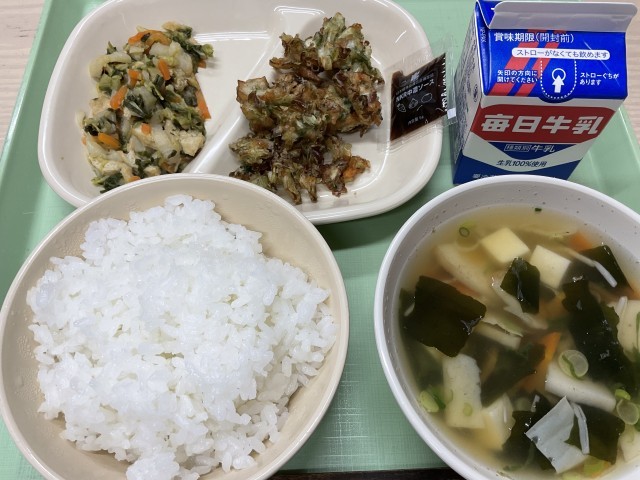 今日の給食のメニューは、「すまし汁・お好み揚げ・大阪白菜の煮浸し・ご飯・牛乳」です。具材の野菜とだしの香りが広がるすまし汁をいただき、桜エビや竹輪、そしてキャベツに紅生姜などをカリッと揚げたお好み揚げ。さらに大阪白菜の煮浸し。どれも美味しくいただきました。