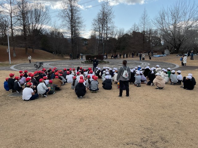 子どもたちと先生たちは徒歩で山田池公園へ向かい、芝生広場に到着後、先生からの諸注意をしっかり聞き、準備体操と掛け声を行ってからスタート地点へ移動しました。