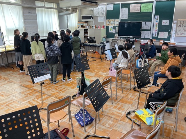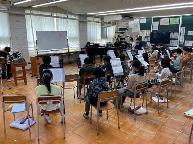 5年生の音楽の授業では、「卒業式入場曲」をリコーダー、鉄琴、木琴、アコーディオンなどの楽器で演奏し、みんなで音をそろえながら集中して取り組んでいます。教室には、美しい音色が広がっています。続いて『Best Friend Forever』の合唱練習を行い、声の出し方や歌い方を意識しながら歌っています。さらに『明日へつなぐもの』では、パートごとに分かれて、しっかりと練習に取り組んでいます。