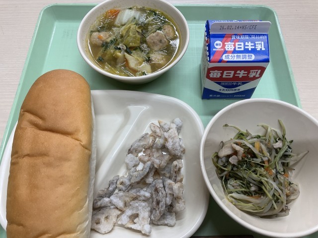 今日の給食の献立は、「白菜と鶏団子のスープ・蓮根の唐揚げ・豆苗の炒め物・コッペパン・牛乳」です。白菜と鶏団子のスープは、ふんわりとしたスープに鶏団子と白菜の甘みが溶け込み、カラッと揚がった蓮根の唐揚げも美味しかったです。