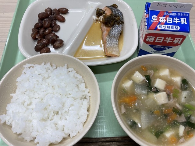 今日の給食の献立は、「餡かけ豆腐・鮭のねぎダレ・金時豆・ご飯・牛乳」です。とろっとしたやわらかいアンが豆腐や色々な野菜に絡み、だしの旨みが広がる料理です。鮭のねぎダレは、焼かれた鮭に香り豊かなねぎダレがよくなじみ、ほどよい甘さとふっくらした金時豆も美味しくいただきました。