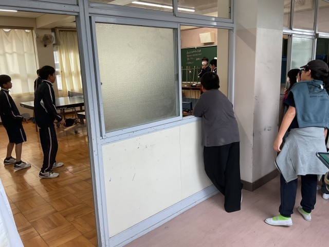 体育館での説明終了後は、中学校内を案内していただき、運動場、体育館、そして校舎内の教室で行われている部活動を見学しました。