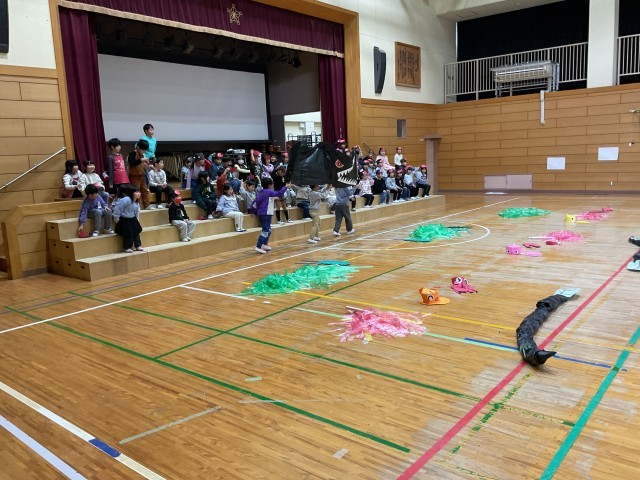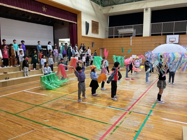 1年生は、オペレッタ『スイミー』を発表しています。保護者の皆さんへの元気な挨拶から始まり、たくさんの可愛らしいスイミー一人ひとりが、覚えたせりふを大きな声で、気持ちを込めて、ジェスチャーも交えながら演じています。