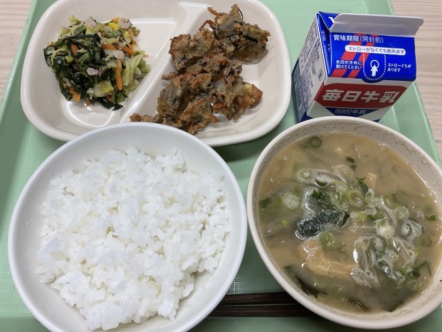 今日の給食の献立は、「味噌汁・けんちん揚げ・白菜の塩麹炒め・ご飯・牛乳」です。玉ねぎやじゃがいもなどの具材の旨みが溶け込み、コクもある一杯です。けんちん揚げは、外はカリッと香ばしく、中は豆腐や野菜の風味があり、白菜の塩麹炒めは、塩麹の力で白菜の甘みが引き立ち、やさしくまろやかな味の一品です。今日も美味しくいただきました。