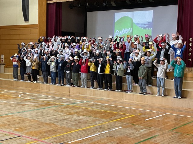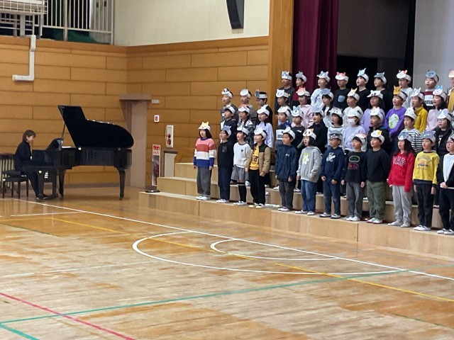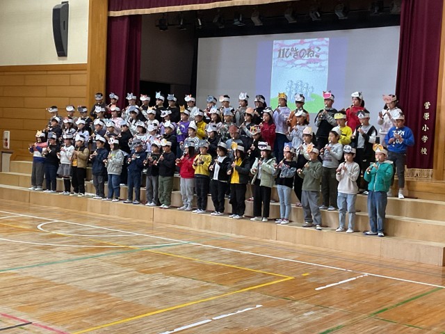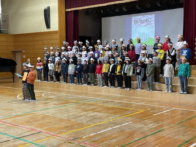 リコーダー奏「花笛」では、子どもたち一人ひとりがドキドキしながらも、音を大切にしながら、しっかりと演奏しています。全員の気持ちと音を丁寧にそろえ、息の合った演奏を披露することができています。オペレッタ「11ぴきのねこ」では、せりふをしっかりと覚え、声の強弱や抑揚を工夫しながら表現し、可愛らしい動きやユニークなセリフも随所に見られ、観ている側も楽しみながら鑑賞することができました。また、オペレッタの中での色々な合唱では美しいハーモニーが響き、3年生の思いがメロディーにのって、6年生や保護者の皆さんにしっかりと届けられています。