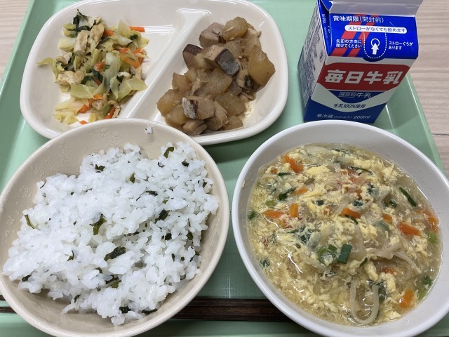 今日の給食の献立は、「かき玉汁・ぶり大根・煮浸し・わかめご飯・牛乳」です。出汁のまろやかな味とふんわり卵が入ったかき玉汁。ぶりの旨みと出汁が染み込んだぶり大根。程よい出汁の味がキャベツや青梗菜などの野菜に染み込んだ煮浸し。わかめご飯は、子どもたちのお気に入りです。今日も美味しくいただきました。