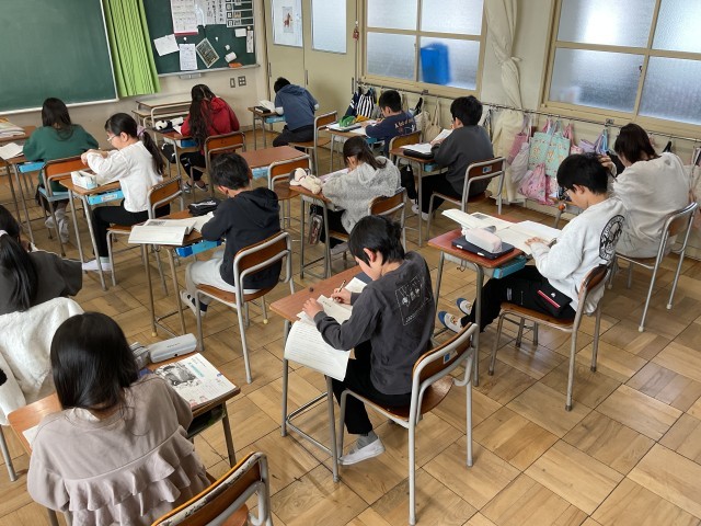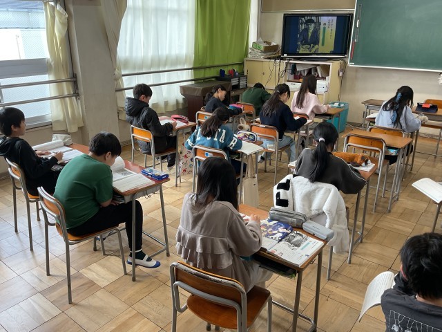 5年生の国語の授業の様子です。子どもたちは、教科書に掲載の『手塚治虫』の伝記の音声を集中して聞きながら、手塚治虫の生き方や戦争の恐ろしさや平和の大切さ、命の尊さについて考えています。聞き取った内容をもとに、自分の感じたことや考えたことを振り返り、生きることについて自らの考えを深めながら、感想文にまとめていきます。