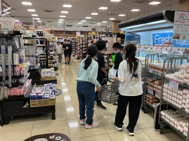 明日の「弁当作り」に向けて、班で相談して決めたおかずを作るため、限られた費用の中で必要な食材を考え、買い物をしています。実際に購入する場面では、予定していた価格と違っていたり、野菜がバラ売りされていなかったりと、さまざまな場面で悩みながら、考え、相談して買い物を進めています。このような経験も、子どもたちにとってとてもよい学びとなっています。