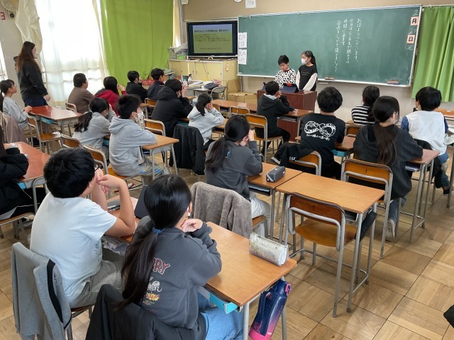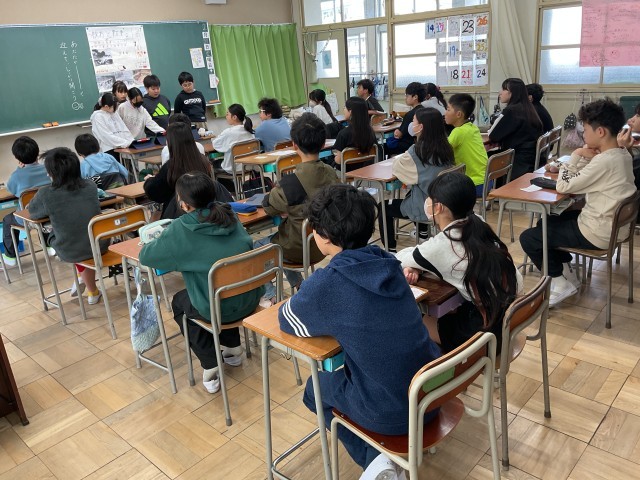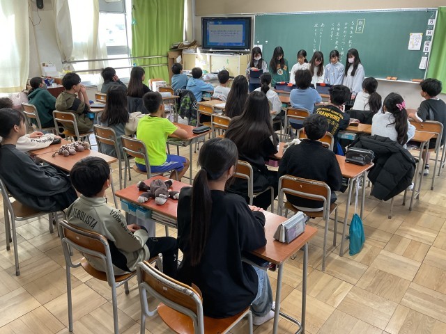 朝の会の時間帯に、6年生の各教室で、5年生が6年生に向けて、「3月1日、枚方平和の日」に因んで、平和について学んだことを報告しています。