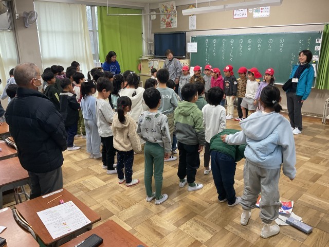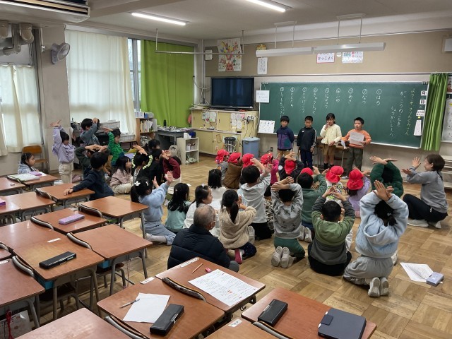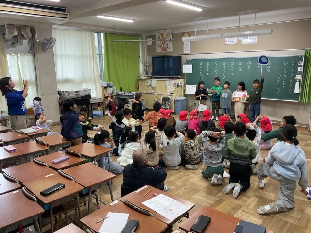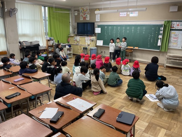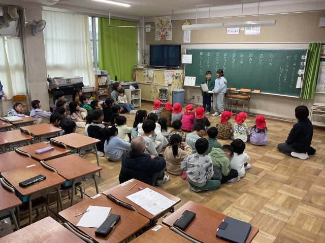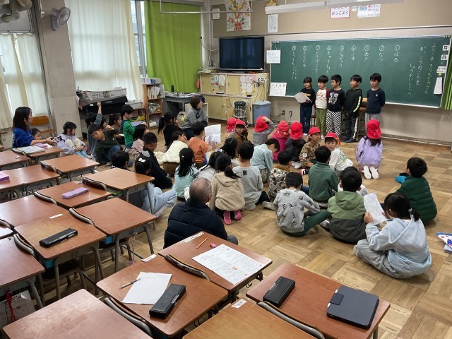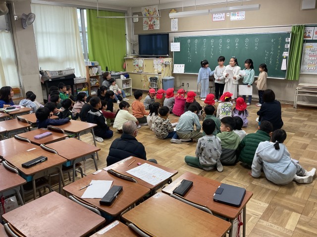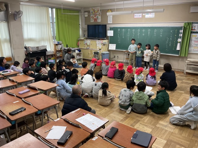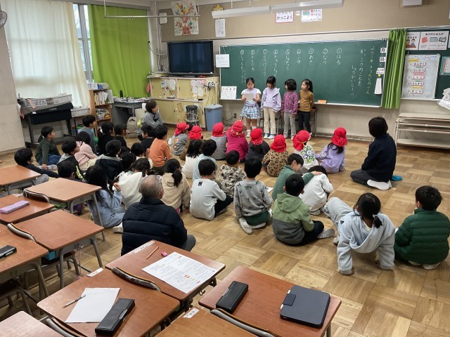 1年生の授業では、本日「保育所と小学校の架け橋プログラム」として、菅原保育所の子どもたちが来校し、1年生と交流しています。1年生は、入学後も安心して学校生活を送ってもらえるよう、自分たちが過ごしてきた1年間の学校生活について発表しています。発表には○×クイズを取り入れ、楽しく興味をもって聞いてもらえるよう工夫しています。内容は、春・夏・秋・冬に行った活動や授業、給食、登下校の様子、友だちとの関わり、質問コーナーなどです。1年生は相手のことを考えながら、分かりやすく伝えようと一生懸命取り組んでいました。