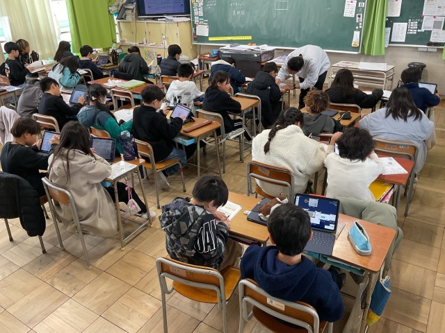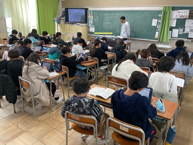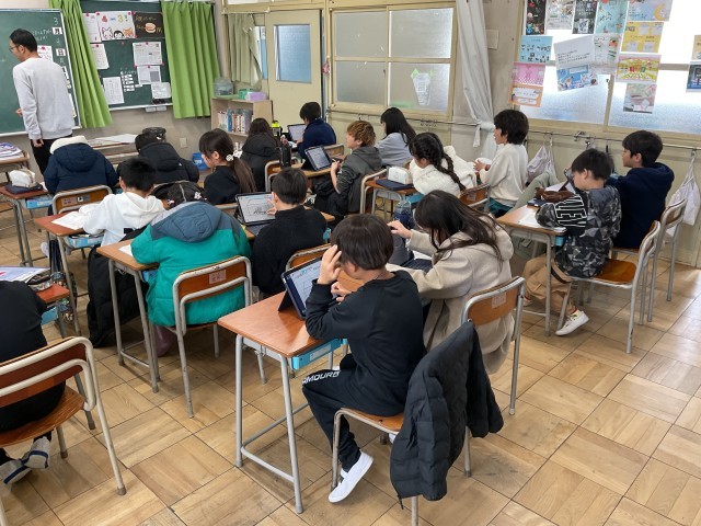 4年生の算数の授業の様子です。直方体や立方体の全体の形が分かるような図を描くことをねらいとして、教科書やタブレットを活用しながら見取り図を描いています。学習では、平面上で向かい合う辺が平行になるように意識し、線の傾きに注意しながら丁寧に描いています。子どもたちは、形の特徴を捉えながら、立体を正しくイメージし、学習に取り組んでいます。