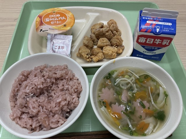 今日の給食は、6年生にとって小学校生活最後の特別な献立です。澄んだだしの味わいが心に染みるお祝いすまし汁。外はカリッとしていて、食べやすい大きさの鶏肉の唐揚げ。6年生の卒業を祝う赤飯にごま塩を振りかけ、さっぱりした甘さのみかんゼリーを楽しみ、思い出に残る、心温まる最後の給食となりました。