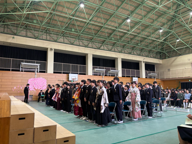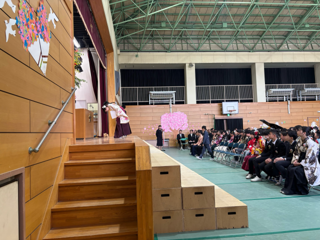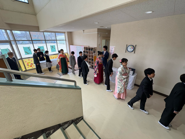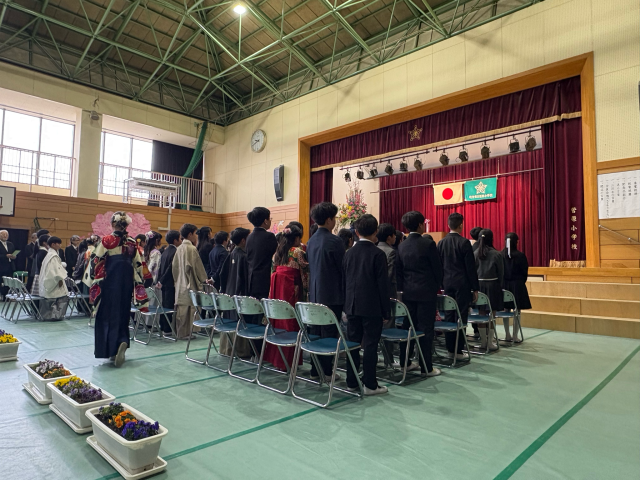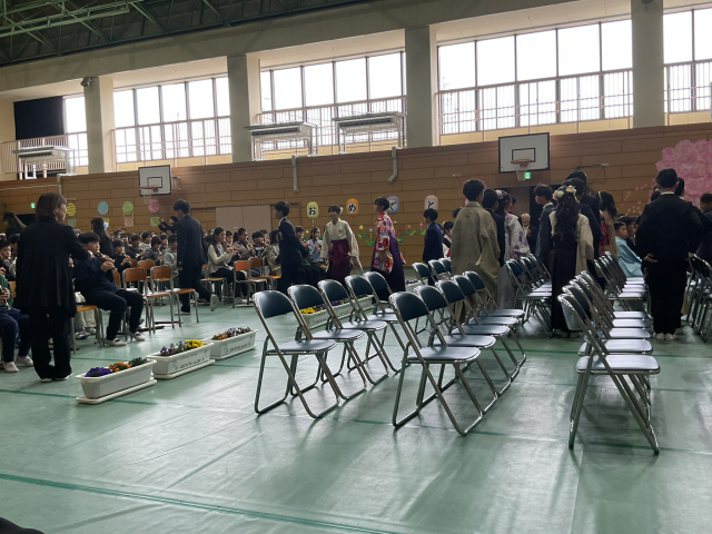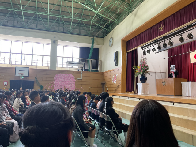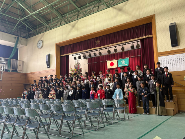卒業証書授与では、卒業生一人ひとりが舞台上で、「中学校で頑張りたいこと」や「将来の夢・希望」について、大きな声で決意を表明しました。自分の言葉で堂々と語る姿はとても頼もしく、これからの成長と活躍が大いに期待されるものでした。また、心を込めて伝えられたお別れの言葉や合唱も、参列者の心に深く響く、感動的なものでした。今日の決意を胸に、それぞれの新たな一歩を力強く歩んでほしいと願っています。