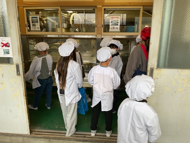 4年生の給食当番の子どもたちの様子です。「こんにちは。4年○組○番です」「いただきます」と挨拶をして、自分たちのクラスの給食を当番の子どもたちが分担して、教室まで運んでくれています。すべてのクラスの子どもたち、一年間、ご苦労様でした。