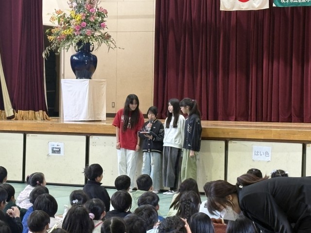 本日、今年度最後の修了式を体育館で行いました。校長先生のお話の後には、美化安全委員会の子どもたちが、クイズ形式で春休みの安全な過ごし方について話をしてくれています。聴いている子どもたちもクイズに答えながら参加し、楽しみながら大切なことを学ぶことができ、とてもよい時間となりました。美化安全委員会の皆さん、ありがとうございました。