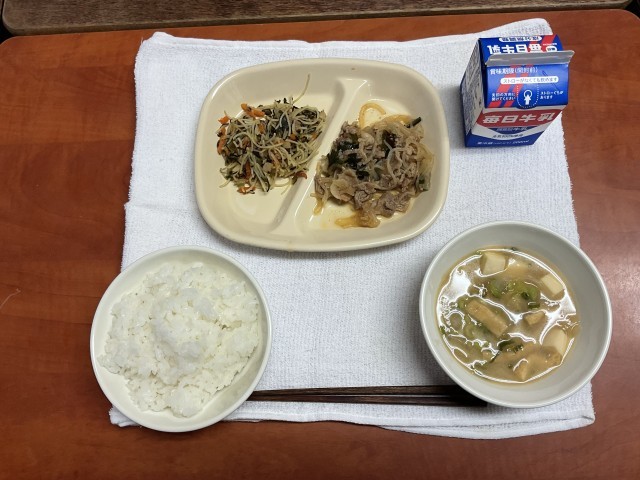 今日は、ご飯、味噌汁、ビーフンの炒め物、ぶたスタミナどん、牛乳でした。