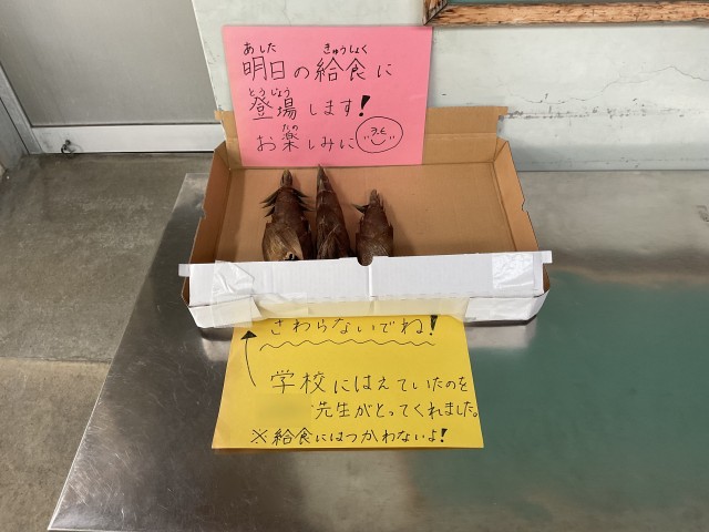 校内に生えていた「たけのこ」を校務員さんが見つけてくれました。調理場前に並べていたら、子供達もびっくりしていました。あまり見たことがなかったのかもしれません。