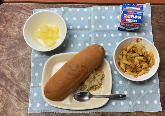 今日の給食は、コッペパン、ラハノサラタ、りんごのかんづめ、ミートペンネ、牛乳です。大おかずに入っていたペンネとは、めんの形が羽ペンの先に似ていることから、イタリア語でつけられたそうです。