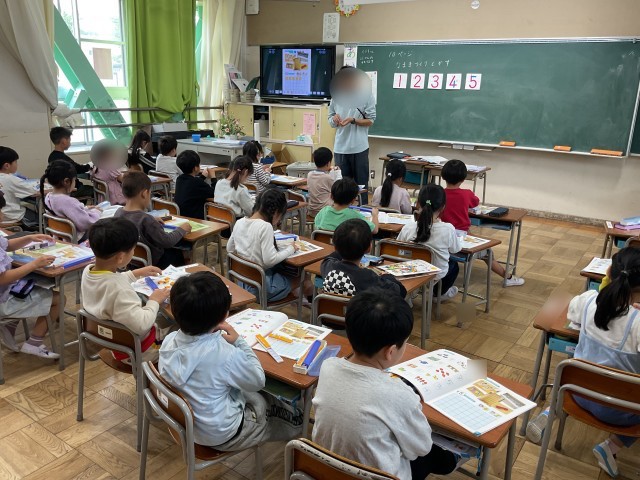 1年生は、ひらがなや数字の学習をしています。今日は、ひらがな「お」の学習でした。2画目の直線から最後の丸くするところに苦戦していた子もいましたが、みんな集中して丁寧に書いていました。