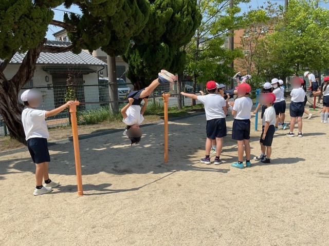 2時間目、運動場では4年生が鉄棒に取り組んでいました。先生や友達にフォローしてもらいながら、練習に励んでいました。腕を縮める、足を曲げる等、ポイントは色々ありますが、練習を繰り返していく中で回るコツが掴めてくると思います。あきらめずに、チャレンジしてほしいです。