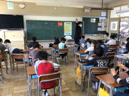 本日、地図帳の出版社の方に来ていただき、3年生の全学級で地図帳に掲載の地図の見方や調べ方などを教わりました。子どもたちは色々な質問にも積極的に手を挙げて答え、1時間の授業で地図の見方や調べ方を少しずつ理解し習得していました。