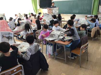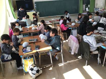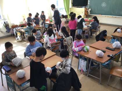 体育の授業で使うボールを新聞紙で手作りしています。最初に、担任の先生からの説明を聴き、その後、新聞紙1枚を、ぎゅっぎゅっと力を入れて丸め、さらに次の1枚をその上から同じように丸く固めています。合計、新聞紙7、8枚程度を同じように繰り返し、新聞紙のボールを作っています。その後、ビニール袋に入れて結び、さらにその上からガムテープを貼り付けて、手作りボールの完成です。力の必要な作業ですが、子どもたちは、懸命に頑張って作っています。
