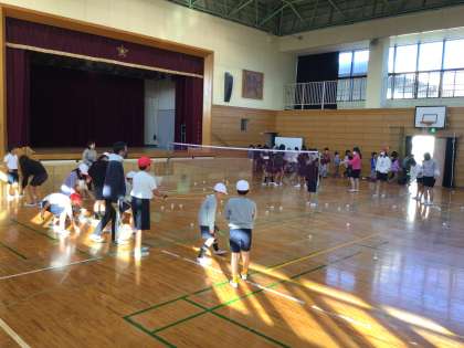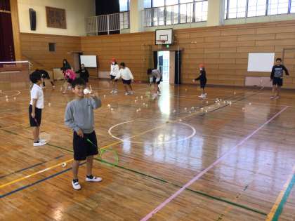 体育館でも、元気にクラブ活動に参加しています。ラケットでシャトルをバシッと。楽しそうです。