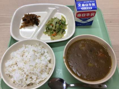今日の給食の献立は、「チキンカレー・青梗菜のソテー・福神漬け・玄米ご飯・牛乳」です。中国生まれの青梗菜は、パンダが日本に初めてきた1972年頃に日本に伝わってきたそうです。なるほど。